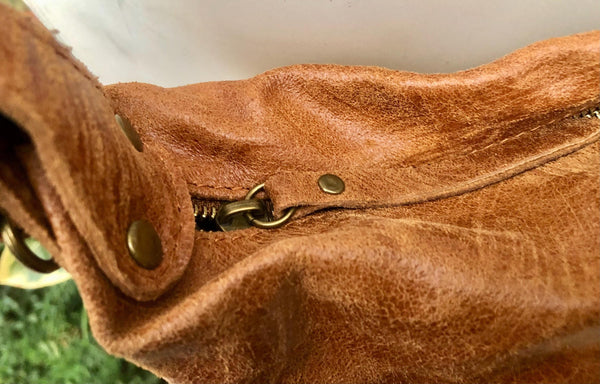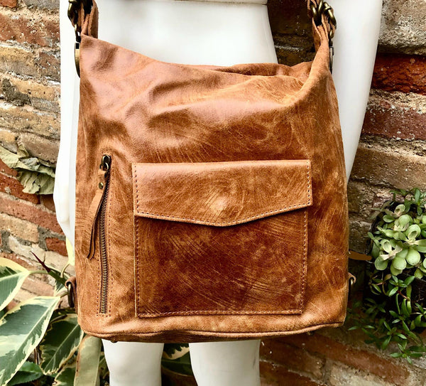 Genuine leather rucksack/ shoulder bag / crossbody in CAMEL BROWN. Zipper closed large tote leather bag in GENUINE leather. Tablet, Ipad or laptop bag.