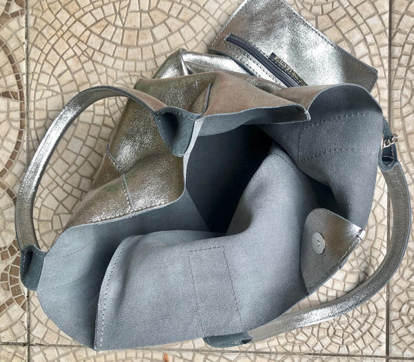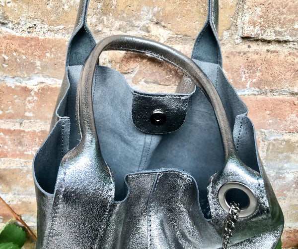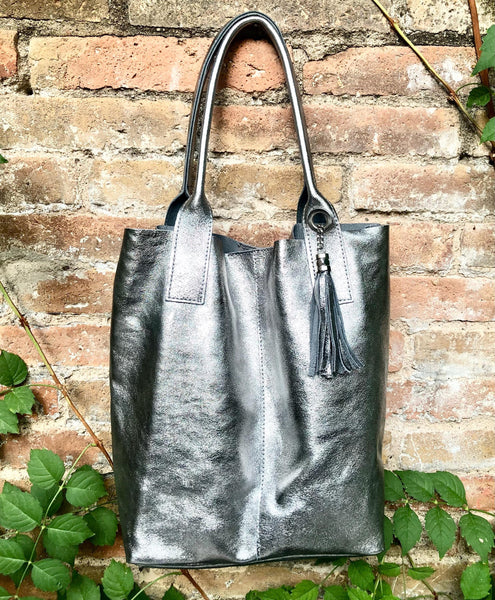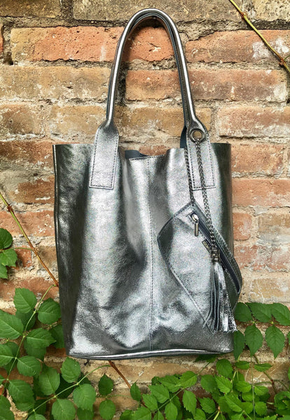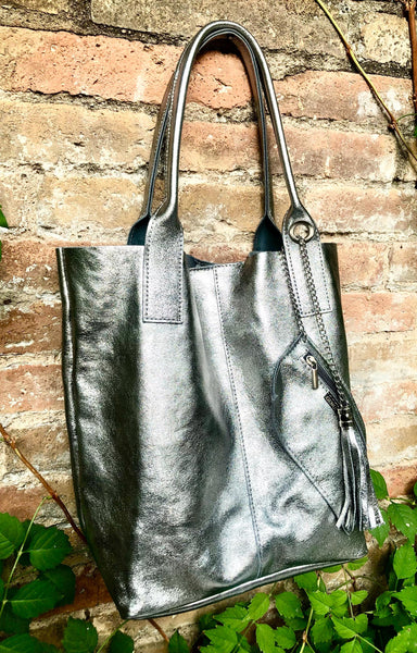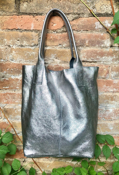 Large tote leather bag in SILVER. Shopper bag. Metallic effect natural GENUINE leather. Large enough for books or a laptop, tablet, cosmetics bag etc.