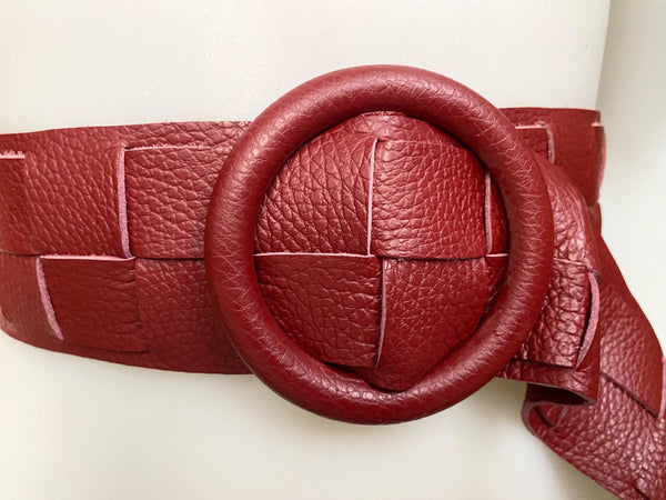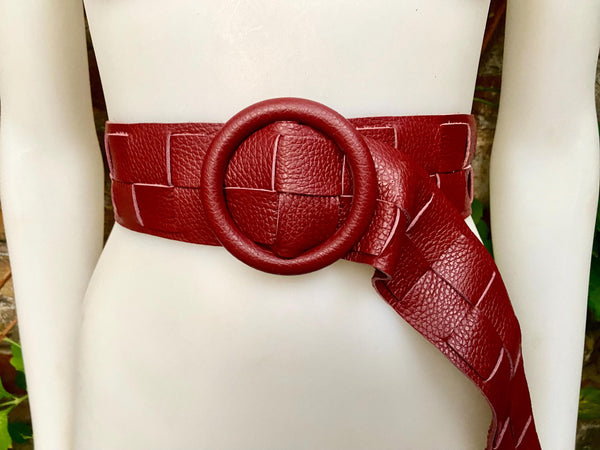 Burgundy wide leather belt with large round buckle, covered in the same color leather. Dark red color braided belt. Wine red waist belt