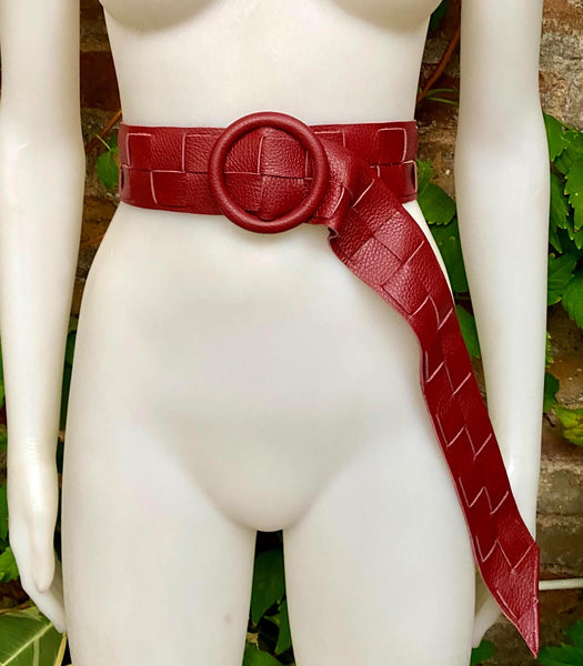 Burgundy leather waist belt with large round buckle. Dark red boho soft genuine leather belt. Wine red wide waist belt.Braided leather