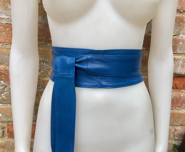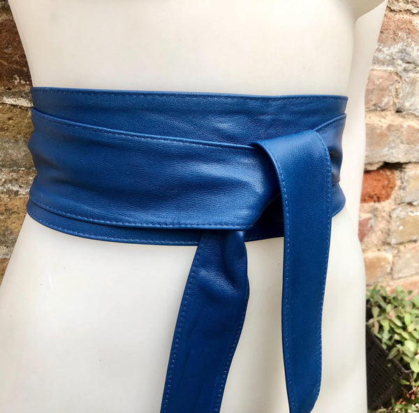 Cobalt blue obi belt in natural soft genuine leather. WIDER MODEL wrap belt. Genuine leather waist belt in royal blue. Soft leather blue dress belt.