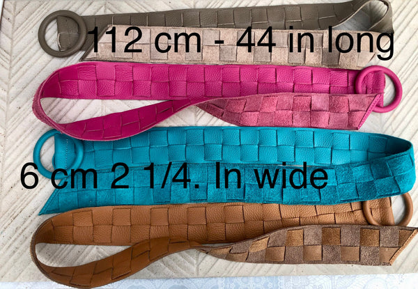 The belt is 112 cm - 44 in long and 6 cm, 2 1/4 in