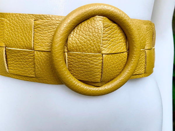 Mustard yellow belt in soft genuine leather. Warm yellow wide dress belt with large round buckle, covered in the same color leather. Braided style.