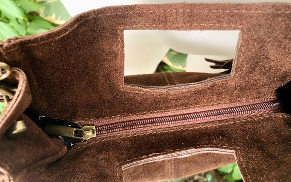 Dark brown crossbody bag in suede leather with fringes. Chocolate brown suede boho bag . Natural genuine suede leather. Hippy suede fringe bag.