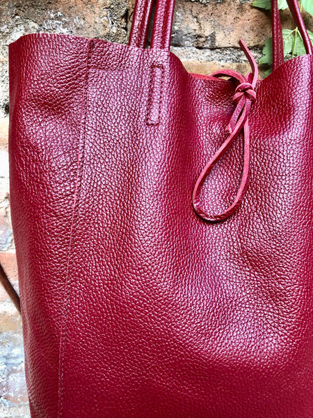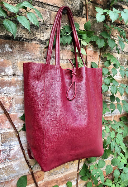 Large tote leather bag in BURGUNDY. Dark red color shoulder bag. Natural GENUINE leather. Large enough for books or a laptop, tablet, cosmetics bag etc.