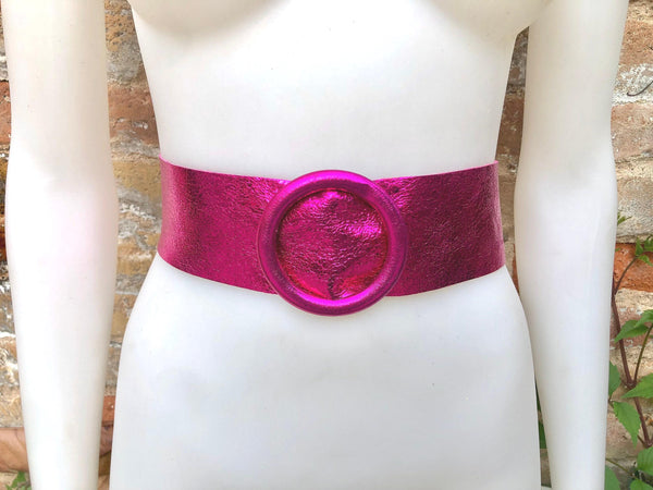 HOT PINK color belt in metallic effect GENUINE leather. Large round metallic buckle in FUCHSIA PINK