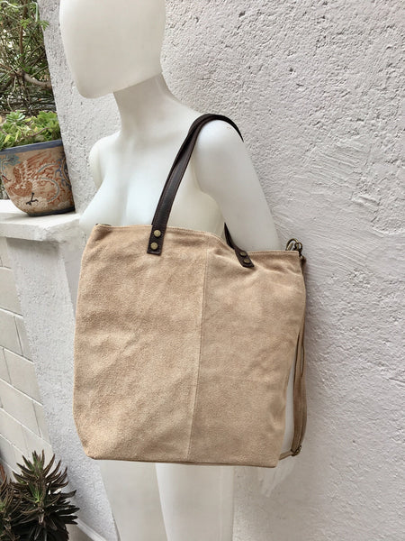 Tote suede leather bag in LIGHT BEIGE. Natural genuine suede leather. Beige large shoulder or cross body bag.Closed by a zipper, with shoulder straps in brown grain leather and removable longer adjustable straps in suede.