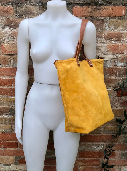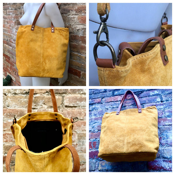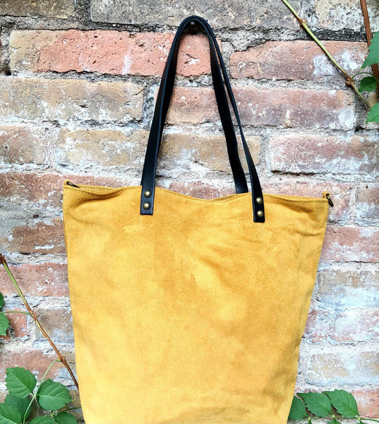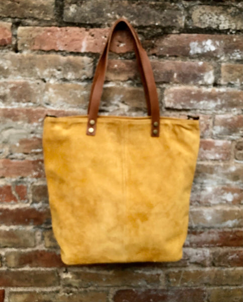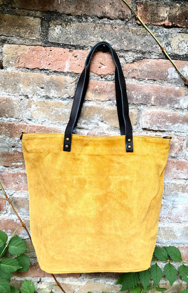 Tote suede leather bag in MUSTARD YELLOW. Natural genuine suede leather. Yellow large boho bag. Closed by a zipper, with shoulder straps and removable cross body adjustable straps.