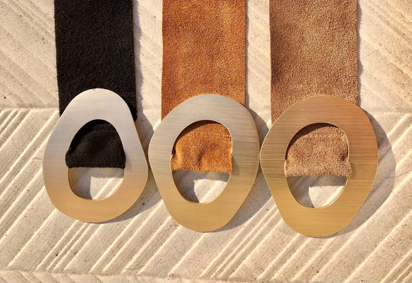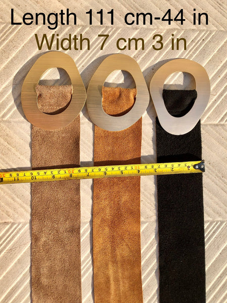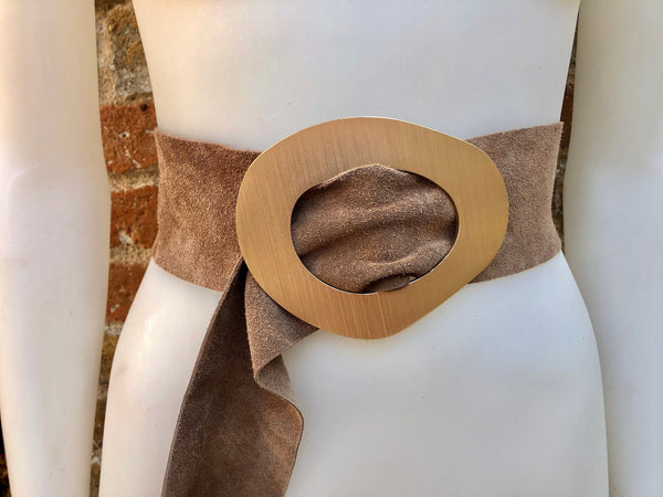 Light brown belt in soft genuine suede leather. Large matte metallic buckle in a soft dark gold - bronze shade. Taupe or grayge color suede leather