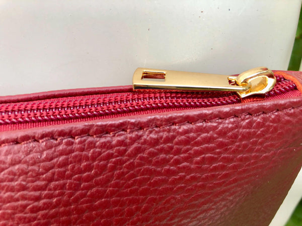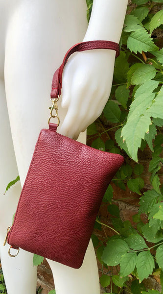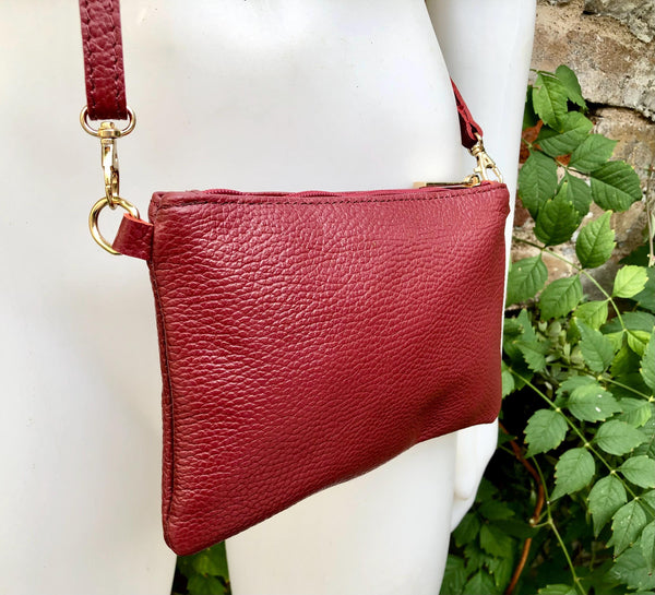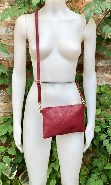 Small leather bag in burgundy . Natural, soft genuine leather. Dark red crossbody or shoulder bag in soft but strong leather. BOHO, Festival cross over bag. Closed with a zipper at the top